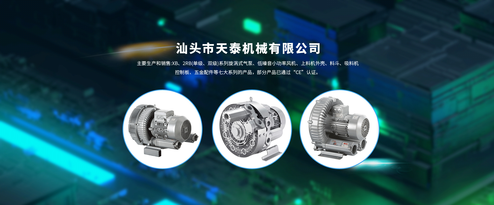 是一家集設計、生產、研究、技術服務于一體的風機制造商。主要生產和銷售:XB、2RB(單級、雙級)系列旋渦式氣泵、低噪音小功率風機、上料機外殼、料斗、吸料機控制板、五金配件等七大系列的產品,部分產品已通過“CE”認證。